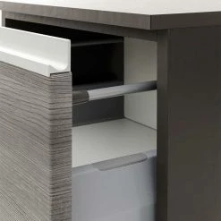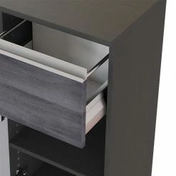- Korpus melaminbeschichtet in Dunkelgrau, Front foliert in Holzoptik Eiche Silbergrau