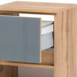 - Oberfläche in Holzoptik Wildeiche melaminbeschichtet, Front zusätzlich mit lackiertem Glas beschichtet