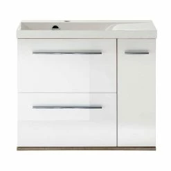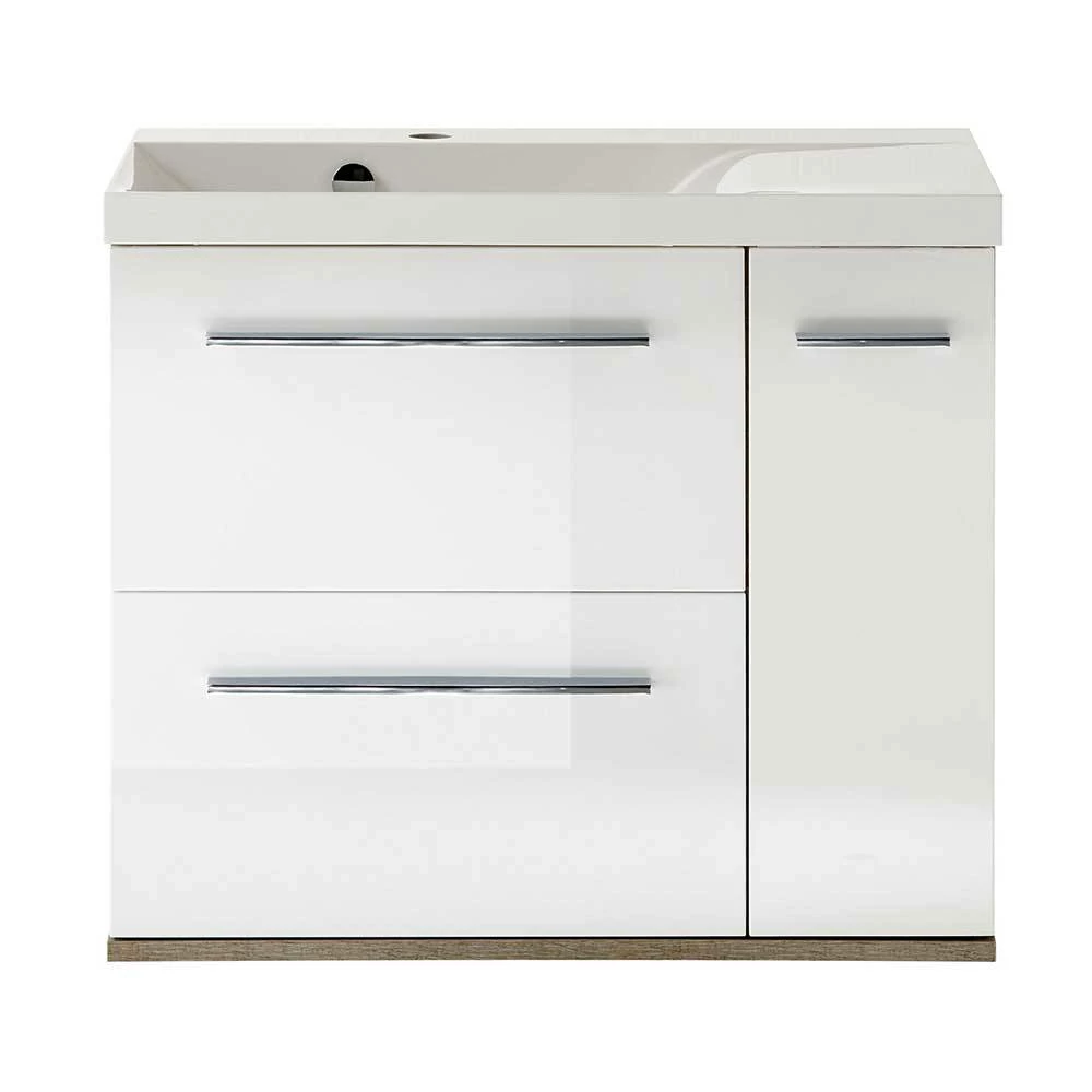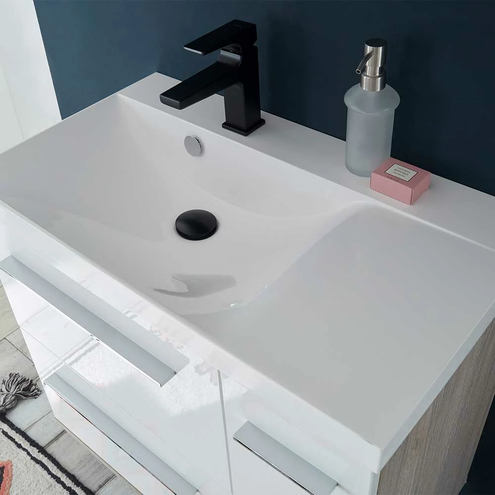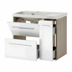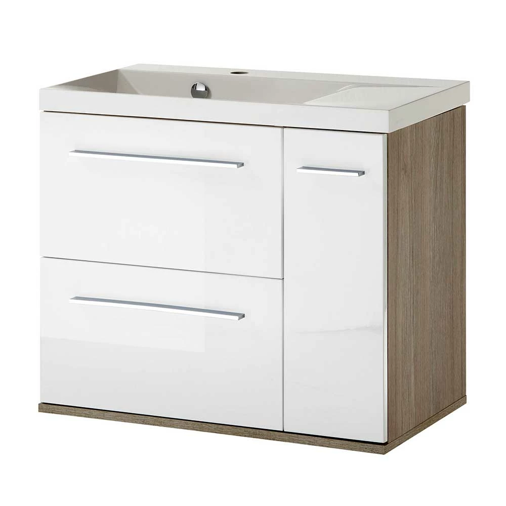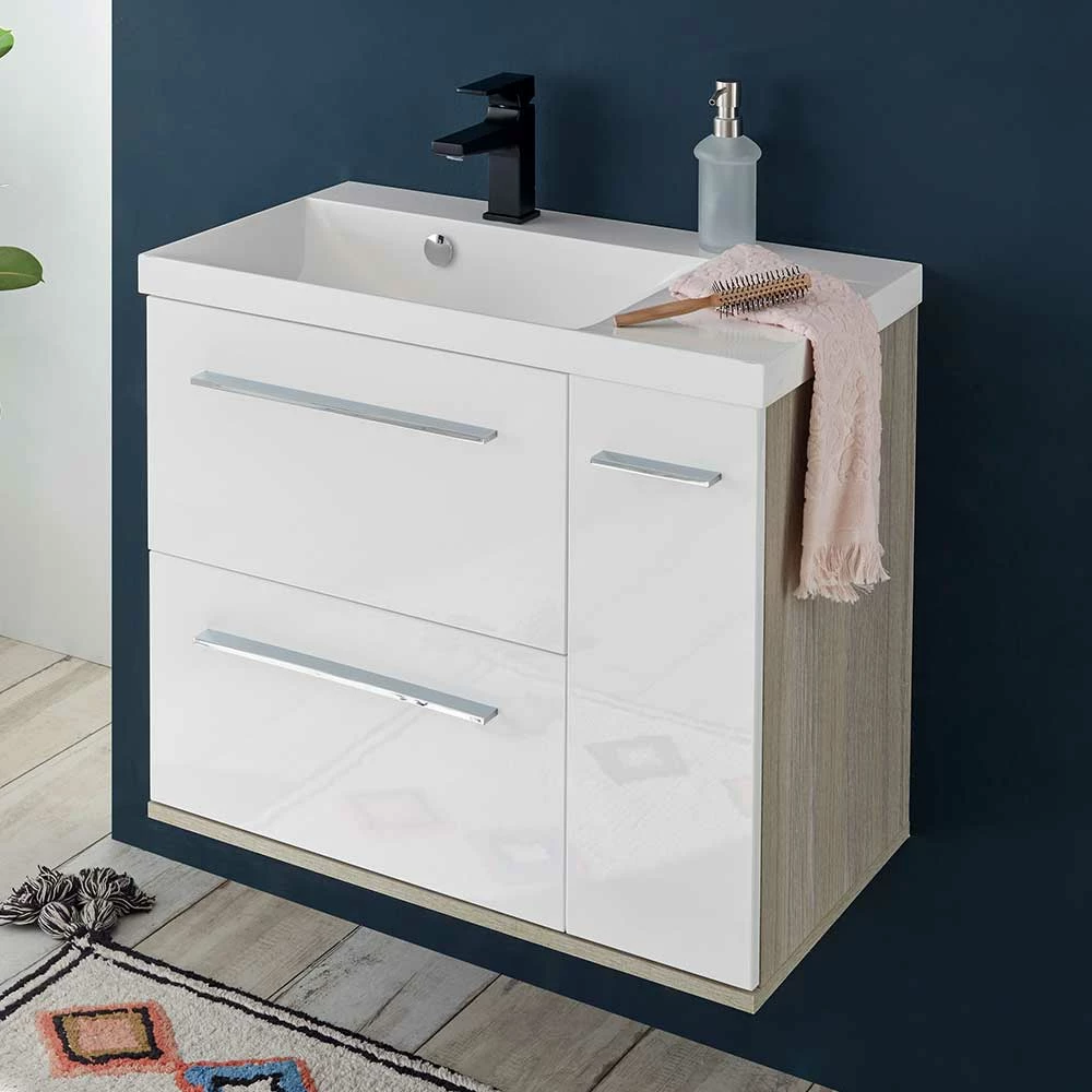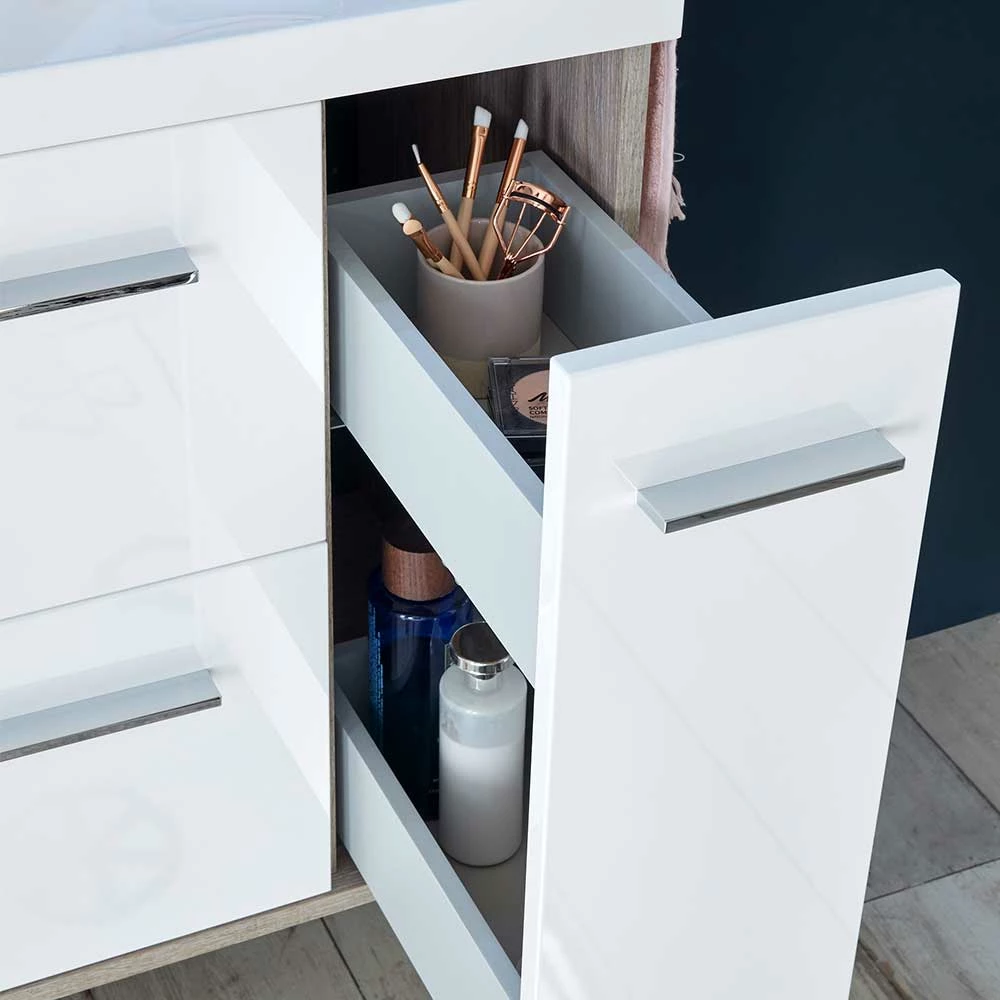 - Geräumiger Waschtisch in Weiß und Eichefarben