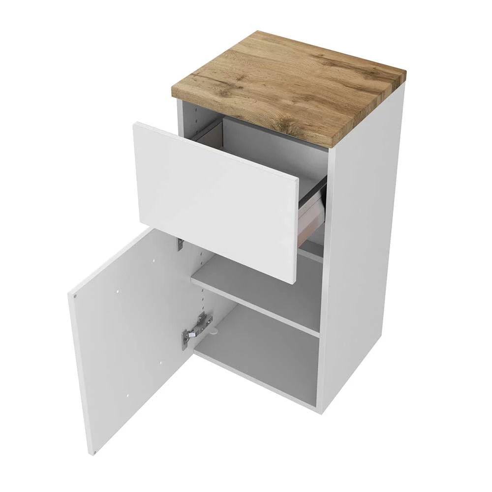 - Korpus melaminbeschichtet, Front foliert in matt Weiß, Deckplatte in Holzoptik Wildeiche