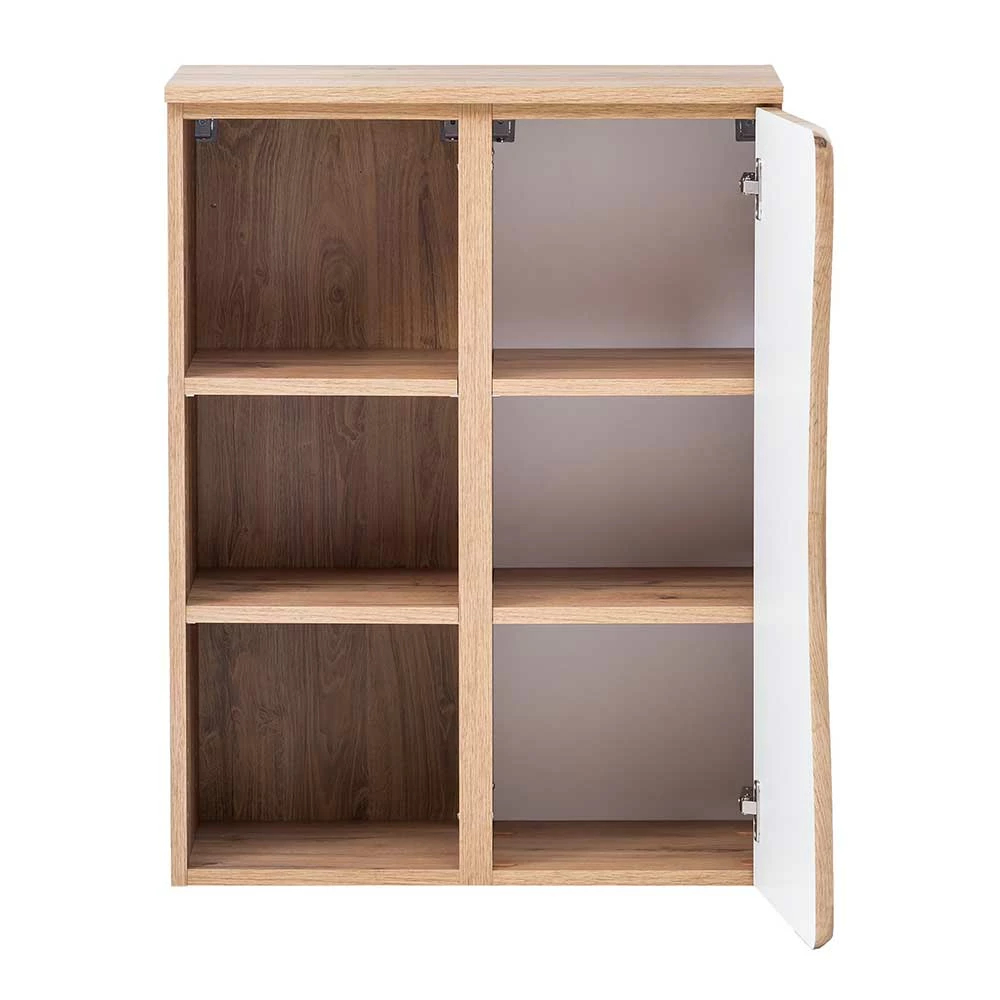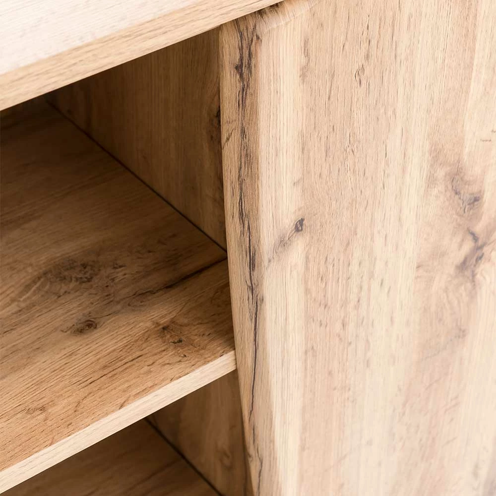 - Oberfläche der Front in Holzoptik Wildeiche foliert, tiefgezogenes Dekor, Korpus melaminbeschichtet, Touchwood, Innendekor weiß