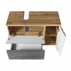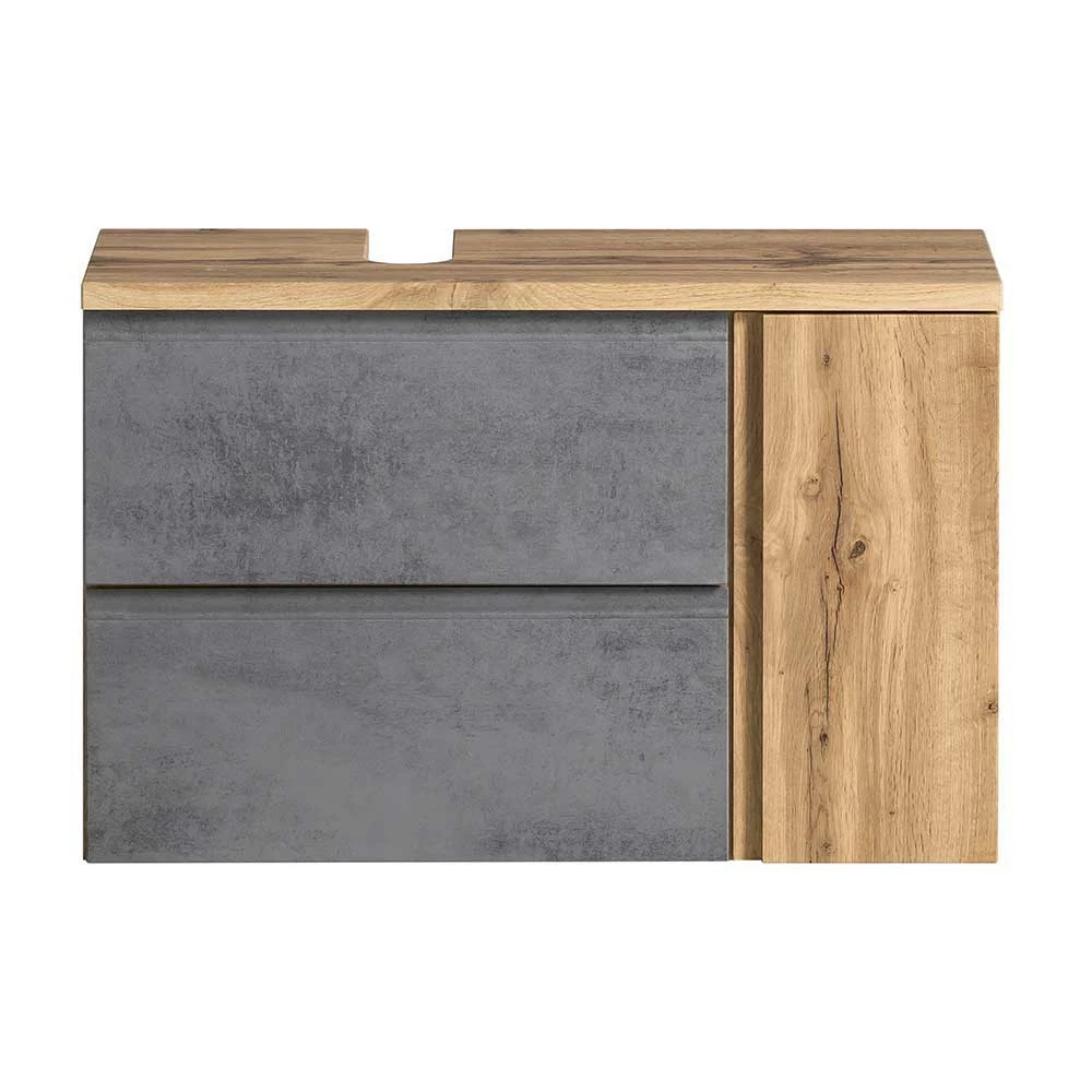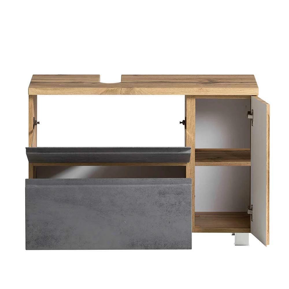 - Geräumiger Waschbeckenunterschrank in Betongrau und Wildeichefarben