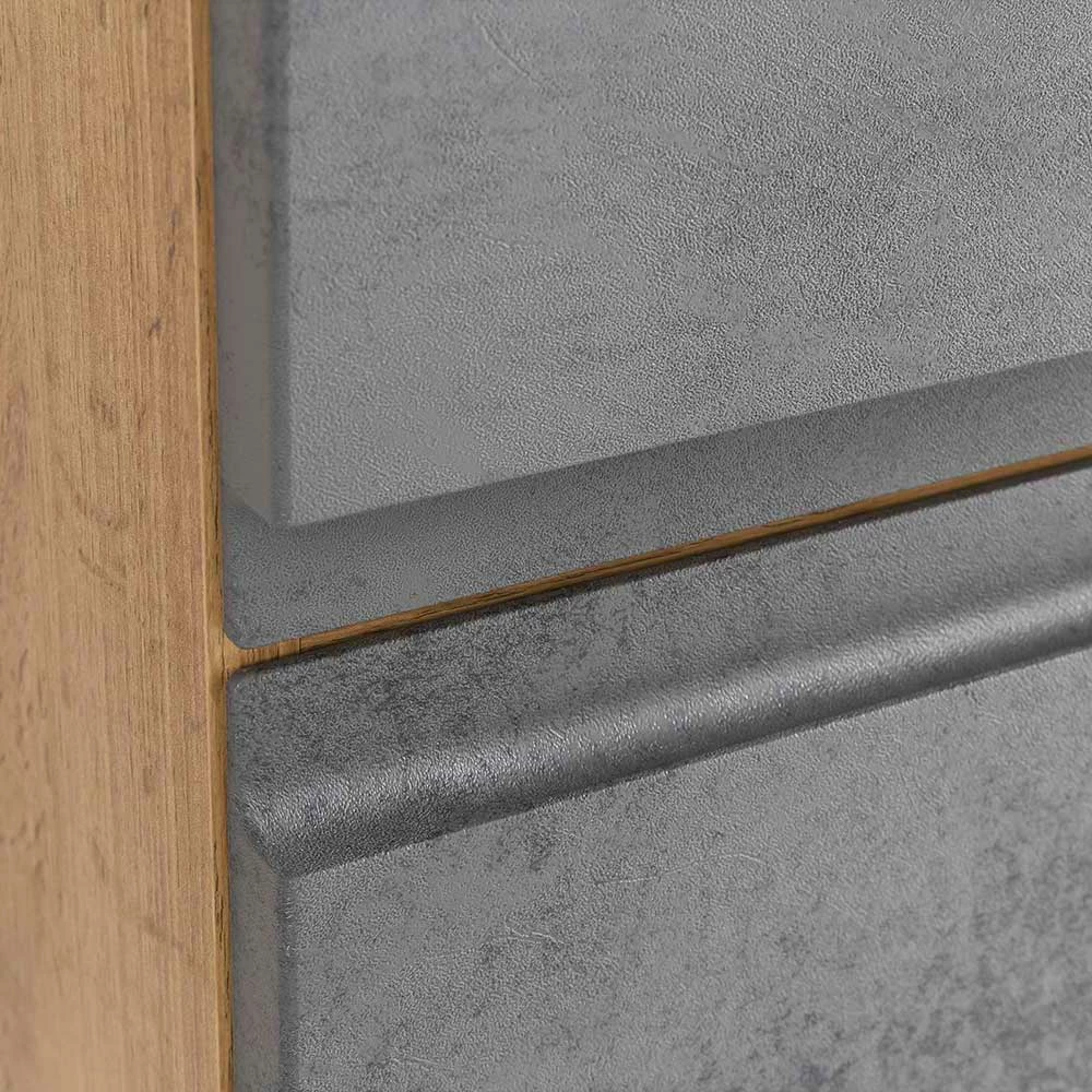- Korpus und Tür in Holzoptik melaminbeschichtet, Schubladenfronten in Betongrau, tiefgezogen foliert