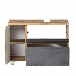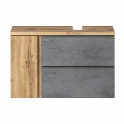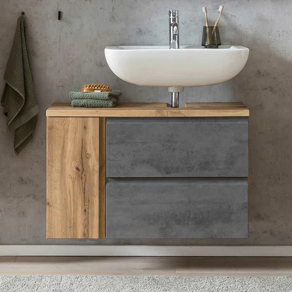 - Geräumiger Waschbeckenunterschrank in Betongrau und Wildeichefarben