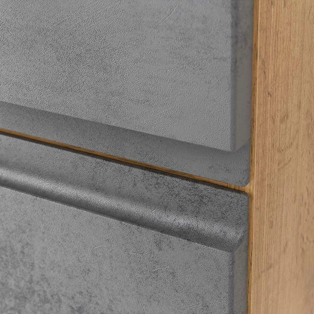 - Korpus und Tür mit Melaminbeschichtung in Holzoptik, Fronten tiefgezogen betongrau matt foliert