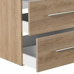 - Pflegeleicht folierte Oberflächen in Holzoptik Eiche hell, Kanten tiefgezogen, Innendekor weiß melaminbeschichtet