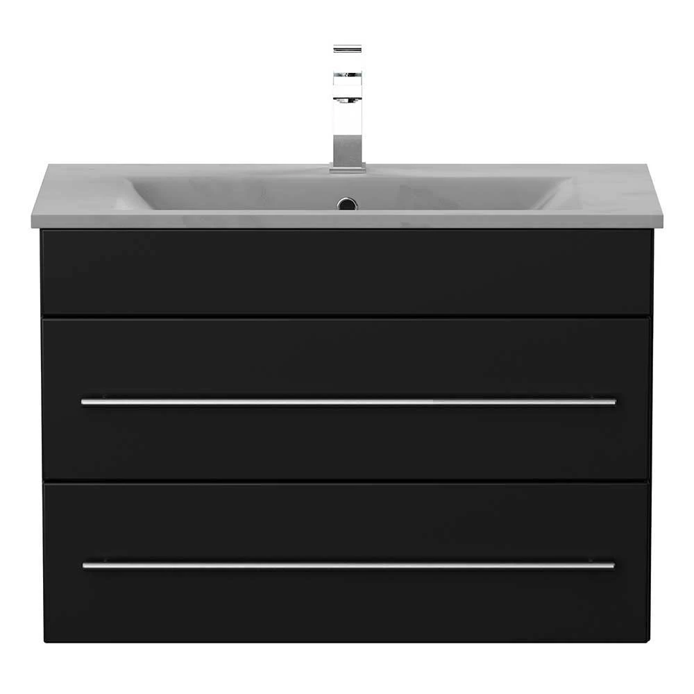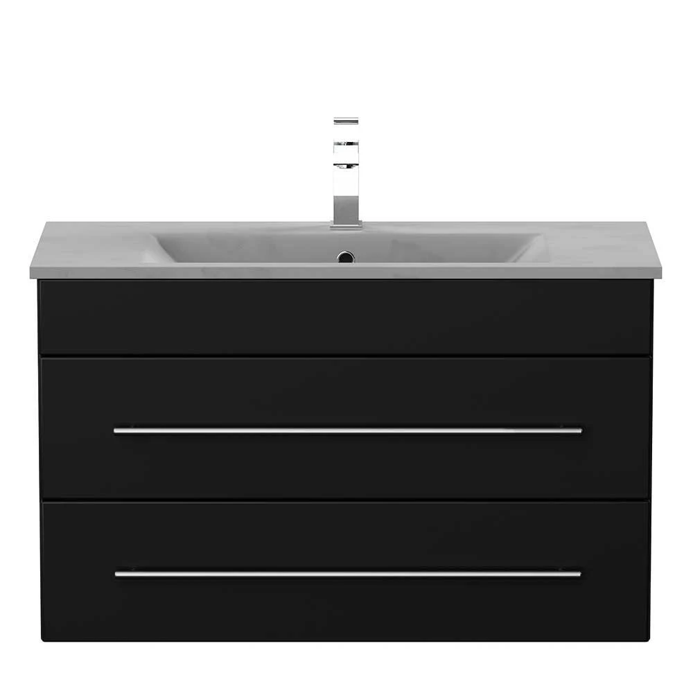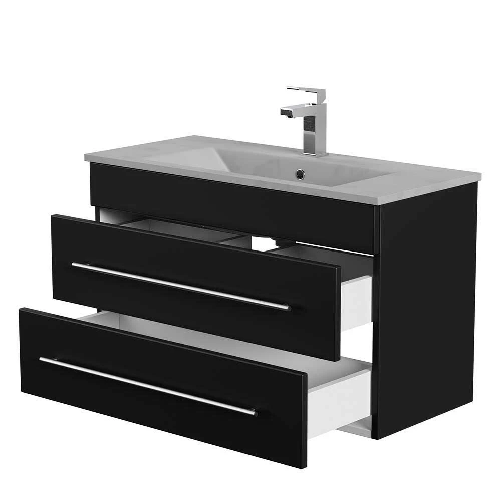 - Strapazierfähig folierte Oberflächen in Schwarz Seidenglanz, Kanten tiefgezogen, Innendekor weiß melaminbeschichtet