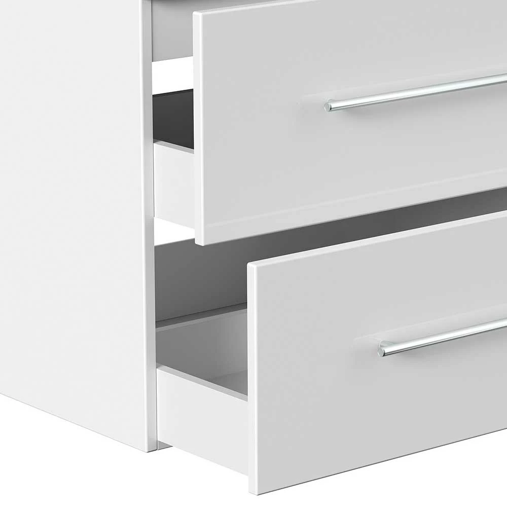 - Pflegeleicht folierte Oberflächen in Weiß Hochglanz, Kanten tiefgezogen, Innendekor weiß melaminbeschichtet