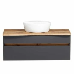 - Oberflächen: Deckplatte und Blende in Holzoptik Wildeiche mit Touchwood melaminbeschichtet, Front Dunkelgrau foliert, Kanten tiefgezogen, Korpus mit leichter Struktur melaminbeschichtet in Dunkelgrau